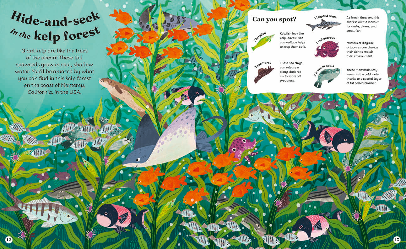 There are millions of creatures hiding in the depths of our oceans! In this beautiful search-and-find book, kids will snorkel around a coral reef, swim along a mangrove, and explore a shipwreck as they have fun for hours searching for sea creatures.
