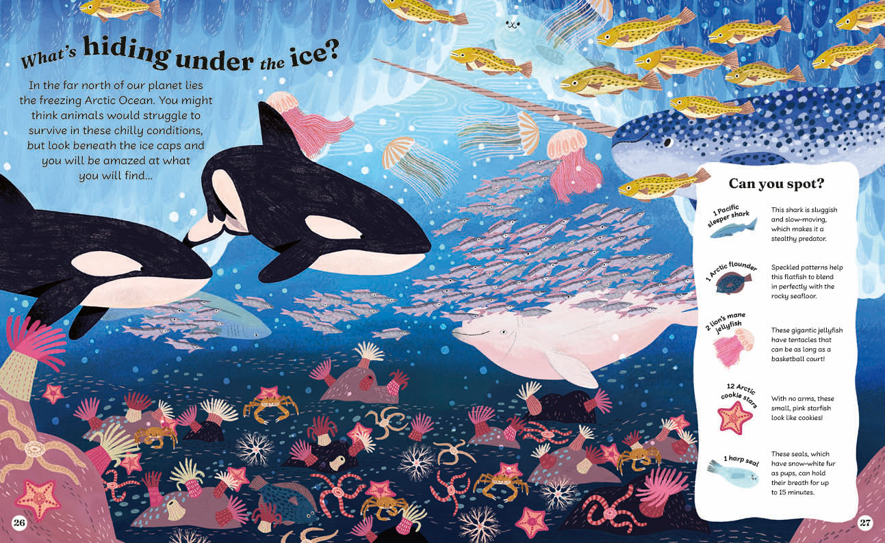Will they be able to spot the sea turtle hatchlings making a dash for the sea? Or the nurse shark having a snooze in the coral reef? How about the narwhals peeking through ice in the Arctic? Kids will also learn that epaulette sharks can “walk”, how a rainbow sea slug defends itself against predators, and why honeycomb eels have two sets of jaws!
